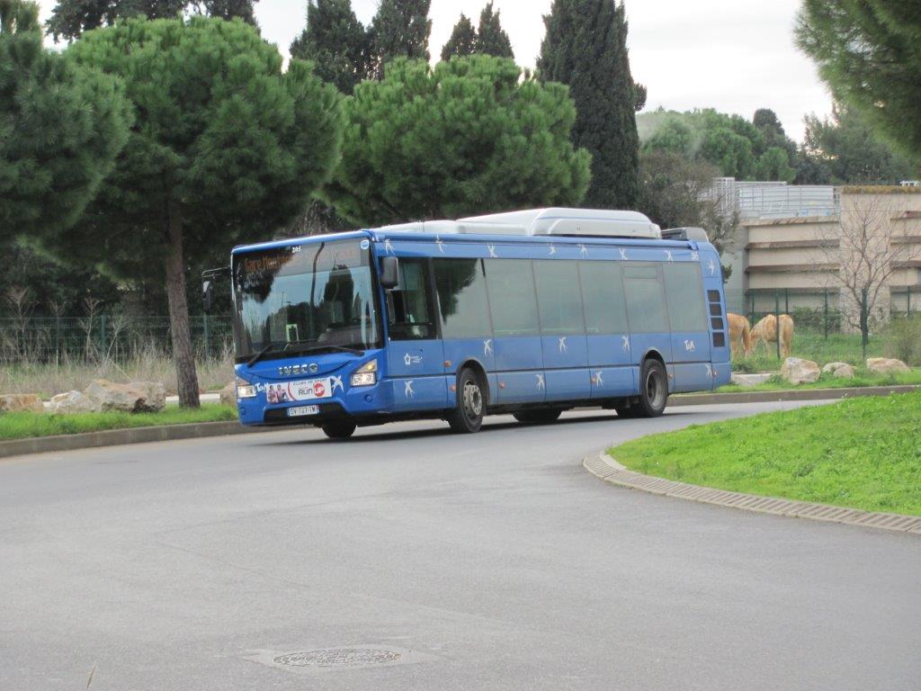 Rond-point du boulevard Pénélope à Montpellier, une navette Gare Montpellier Sud de France roulant à fond la caisse avec une seule passagère à bord, le samedi 15 décembre 2018 à 13h54. Copyright : Edouard Paris