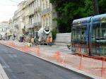 - Rue de la République à Montpellier, la rame 2070 Citadis 402 Alstom est stoppée lors d’une opération du coulage du béton qui remplace des dalles de pierre endommagées, le mercredi 9 mai 2018. Copyright : Anje34