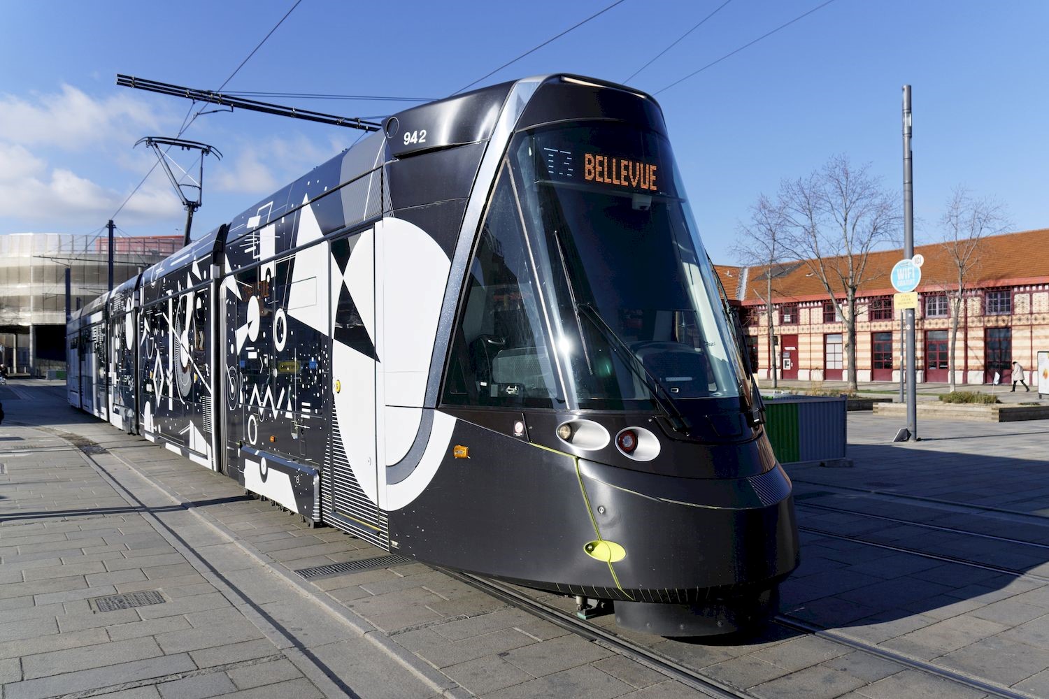 La rame 942 Urbos 3 CAF revêtue de la livrée Biennale Internationale Design Saint-Etienne est photographiée au terminus « Châteaucreux » commun aux lignes T2 et T3, le jeudi 3 janvier 2019. Copyright : Yvon Brument