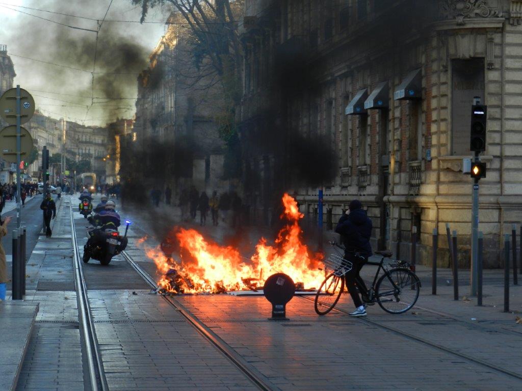 Incendie de poubelles à l’intersection de la rue de la République et de la rue Pagézy à Montpellier. Photo prise depuis un quai de la station « Gare Saint-Roch » commune aux lignes 3 et 4 de tramway, le samedi 5 janvier 2019 après-midi. Copyright : Anje34
