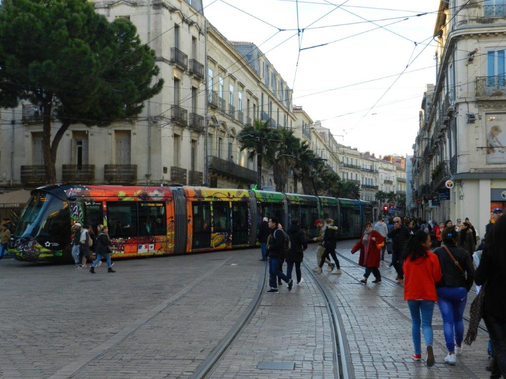 Place Edouard-Adam à Montpellier, une rame Citadis 402 Alstom, opérant sur la ligne 3, entame un long péripble pour rejoindre « Lattes Centre », le samedi 5 janvier 2019 après-midi. Copyright : Anje34
