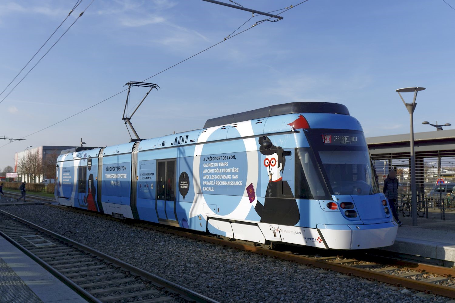 La rame 105 Tango Stadler rhônexpress à la livrée vantant les mérites des SAS PARAFE, dont est équipé l’aéroport de Lyon – Saint-Exupéry, est photographiée à la station « Meyzieu Z.I. » quai direction Lyon « Gare Part-Dieu – Villette », le samedi 5 janvier 2019. Copyright : Yvon Brument