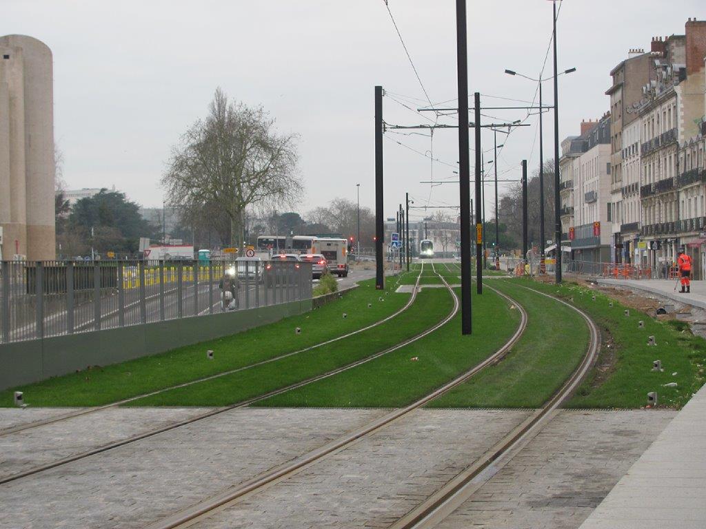 A Nantes, sur la ligne 1 de tramway, nouvelles voies et plateforme engazonnée le long de l’allée du Commandant-Charcot débarrassée de toute circulation automobile. Photo prise le lundi 7 janvier 2019. Copyright : Edouard Paris