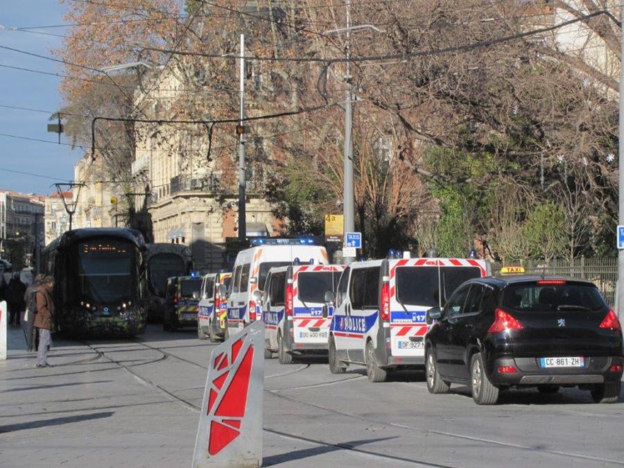 Une colonne de véhicules de la police nationale est photographiée à la hauteur de la station « Gare Saint-Roch » commune aux lignes 3 et 4, rue de la République à Montpellier, le samedi 19 janvier 2019 à 10h59, jour de manifestation des gilets jaunes en centre-ville. Copyright : Edouard Paris