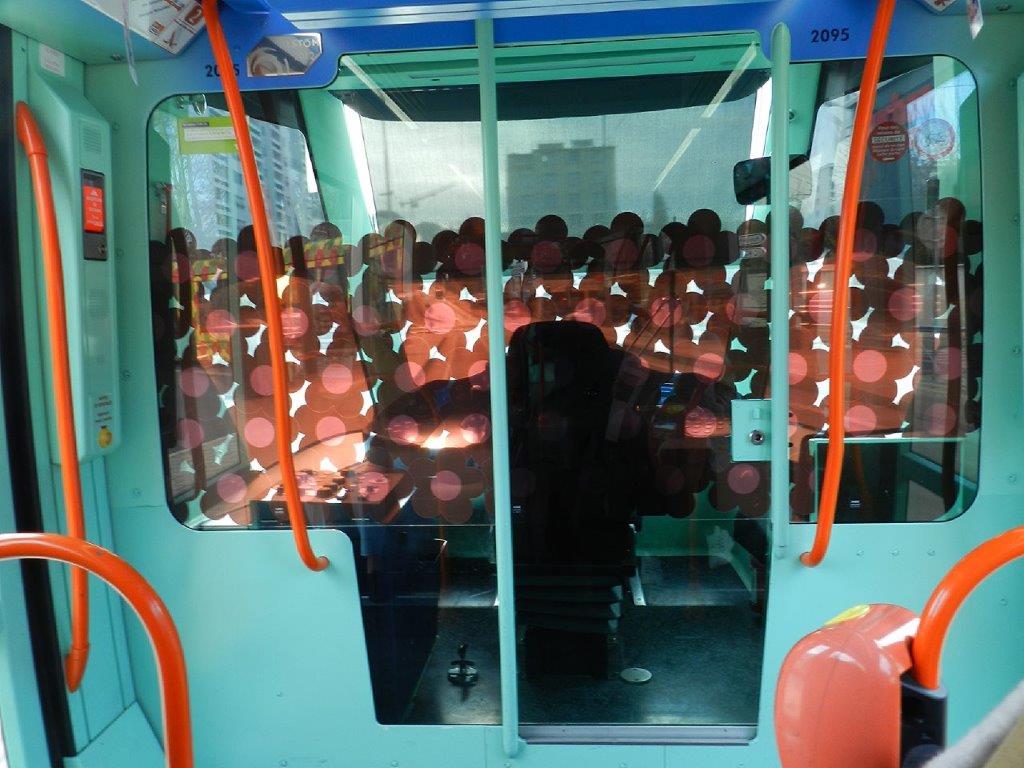 Un film occultant brise-vue appliqué sur la paroi et la porte vitrées séparant la cabine de conduite du compartiment voyageurs d’une motrice. Photo prise dans la rame 2095 Citadis 402 Alstom opérant sur la ligne 2, le vendredi 18 janvier 2019. Copyright : Anje34