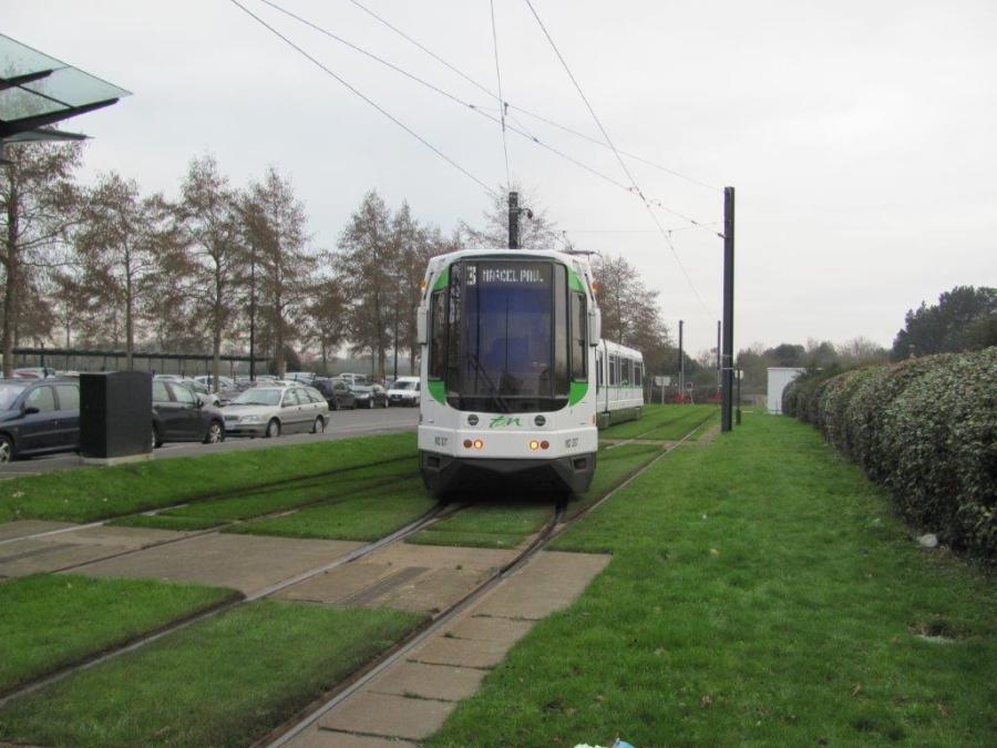 La rame 337 GEC-Alsthom manoeuvre sur une des deux voies en tiroir du terminus sud « Neustrie » de la ligne 3 du réseau de tramways nantais avant de repartir vers le terminus nord « Marcel Paul ». Le prolongement de la ligne vers l’aéroport Nantes Atlantique n’est pas une priorité à ce jour. Photo prise le lundi 7 janvier 2019. Copyright : Edouard Paris