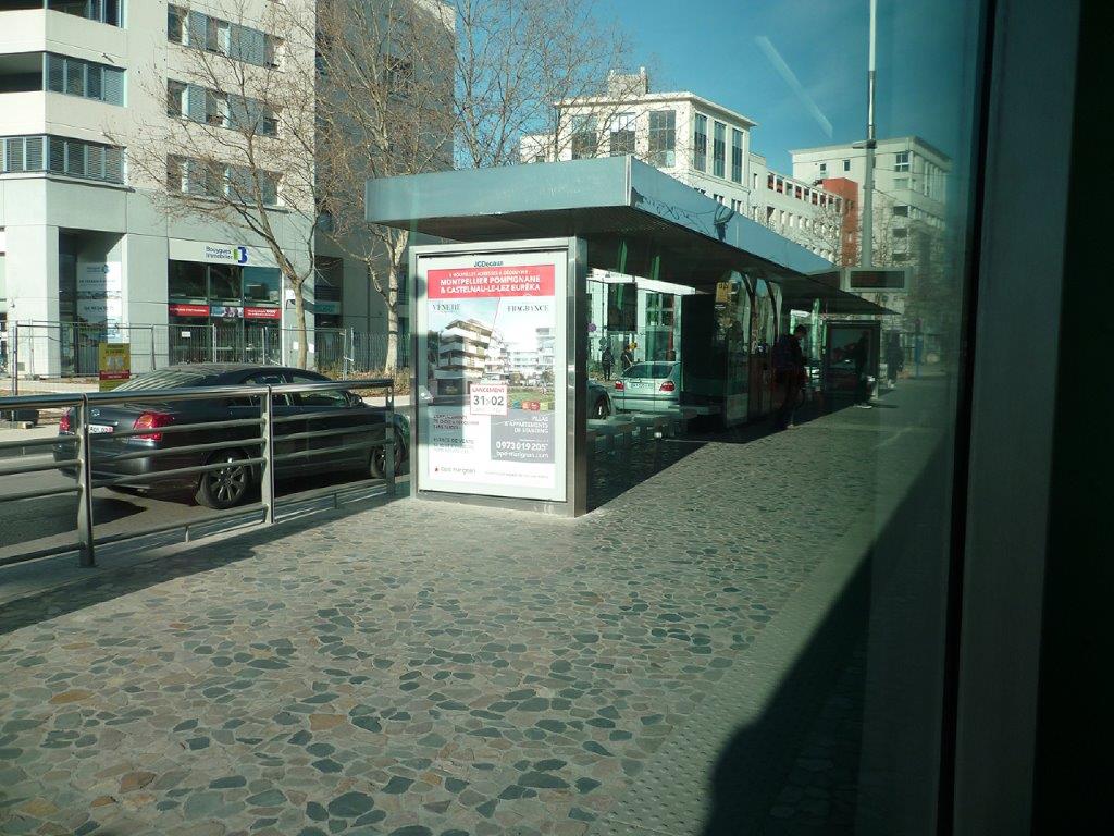 Desserte exceptionnelle de la station « Georges Frêche – Hôtel de Ville » de la ligne 4, sens a, par la rame 2070 Citadis 402 Alstom de la ligne 3 circulant en direction de « Mosson », le samedi 26 janvier 2019 à 15h19. Copyright : Edouard Paris