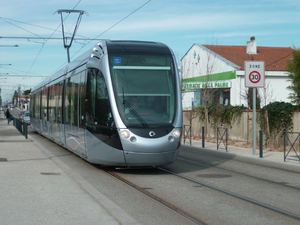 Route de Grenade à Blagnac, sur la ligne T1 de tramway de Toulouse, la rame 5013 Citadis 302 Alstom est photographiée sur le site banalisé tram/voie routière entre les stations « Guyenne – Berry » et « Servanty – Airbus », le mercredi 16 février 2011. Une configuration qui aurait pu être retenue pour la rue Rouget-de-Lisle à Montpellier dans le cadre du projet de ligne 5 de tramway. Copyright : Edouard Paris