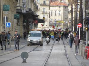 Le cortège des manifestants, dont la majorité était revêtue de gilets jaunes, a quitté la place de la Comédie à 14h30 en direction de la gare Saint-Roch. Arrivé devant la gare, place Auguste-Gibert, il a tourné à droite pour emprunter la plateforme du tronc commun des lignes 2 et 4 de tramway, rue Jules-Ferry, rue Alexandra David-Néel et rue Catalan. Par la suite, le cortège est passé devant la poste Rondelet, puis par la rue du Faubourg-de-la-Saunerie, avant de remonter le boulevard du Jeu-de-Paume…