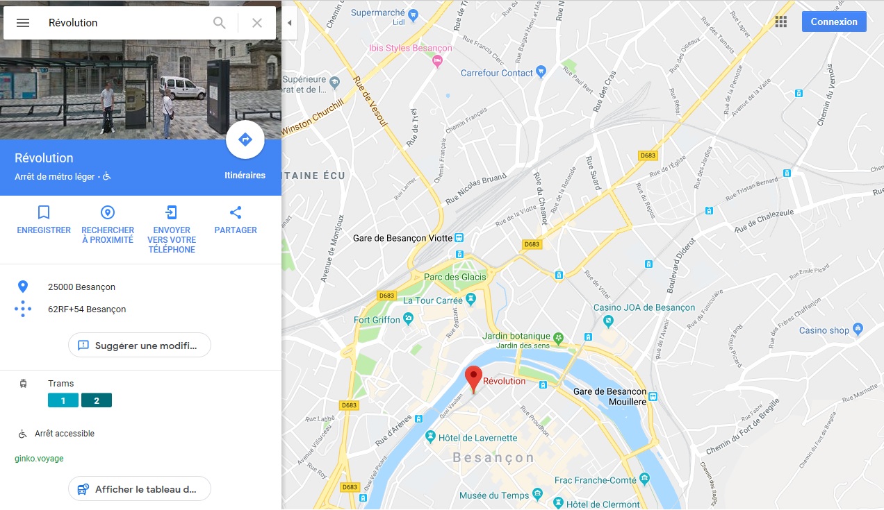Capture d’écran Google Maps faite le lundi 11 février 2019. A Besançon, le fait de cliquer ou d’appuyer à gauche sur le numéro de la ligne de tramway permet de consulter les prochains horaires de la station sélectionnée (se rendre sur Google Maps pour voir les horaires)