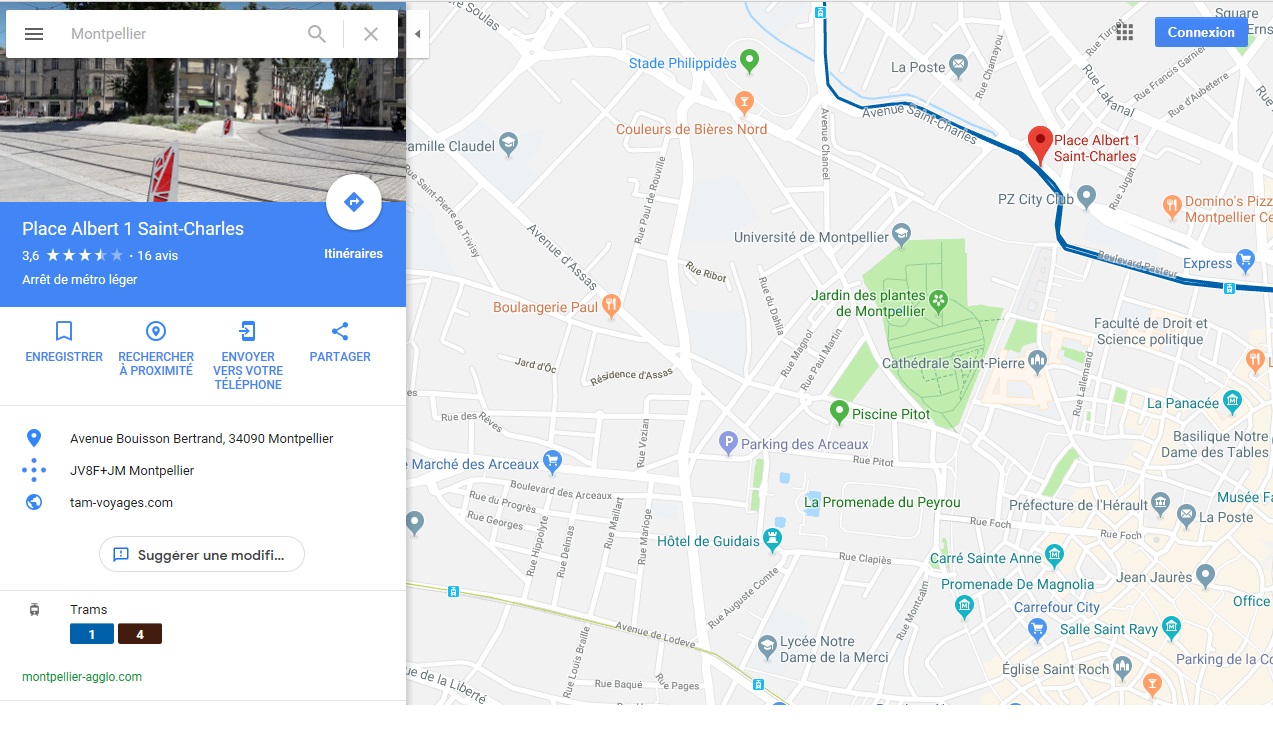 Capture d’écran Google Maps faite le lundi 11 février 2019. A Montpellier, la ligne 4 de tramway n’est toujours pas bouclée sur la carte et le fait de cliquer ou d’appuyer à gauche sur le numéro de la ligne de tramway ne mène à rien (se rendre sur Google Maps pour voir le résultat)