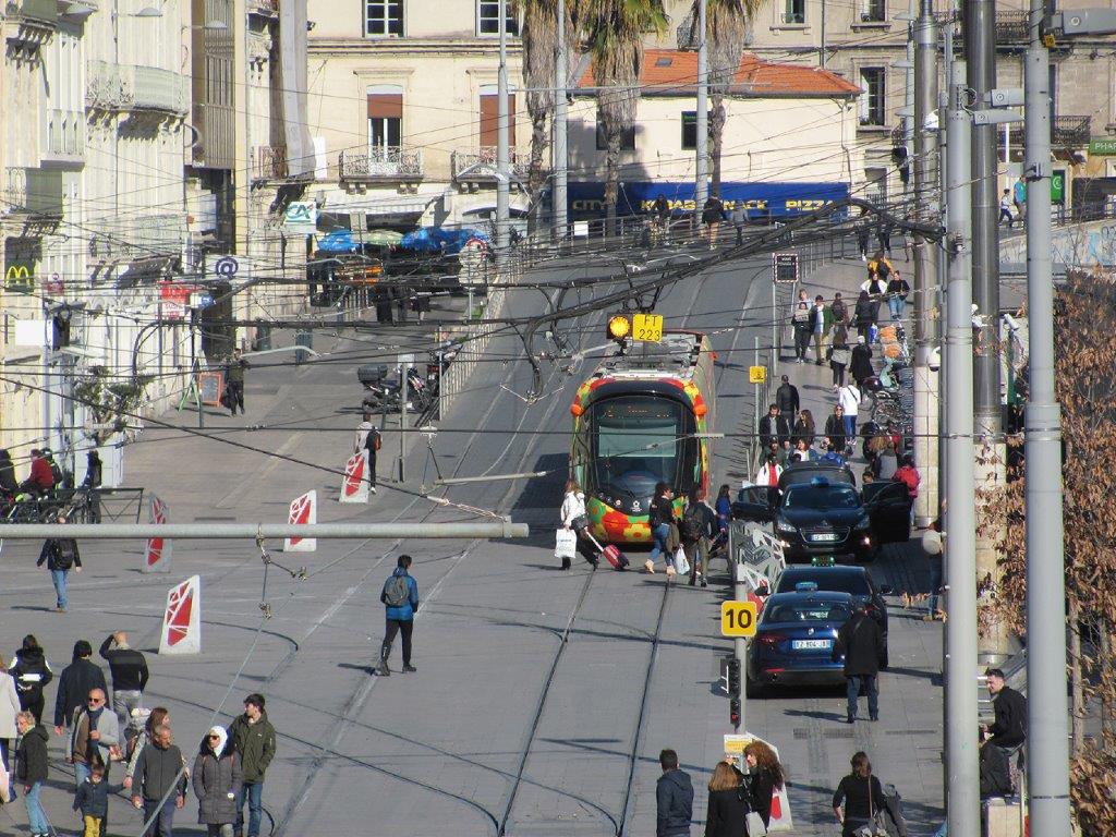 Acte XIV des gilets jaunes oblige, une rame Citadis 402 Alstom, opérant sur la ligne 2, est obligée de changer d’itinéraire, pour rejoindre la station « Corum » via « Rives du Lez » et « Pompignane », le samedi 16 février 2019 à 14h27. Copyright : Edouard Paris
