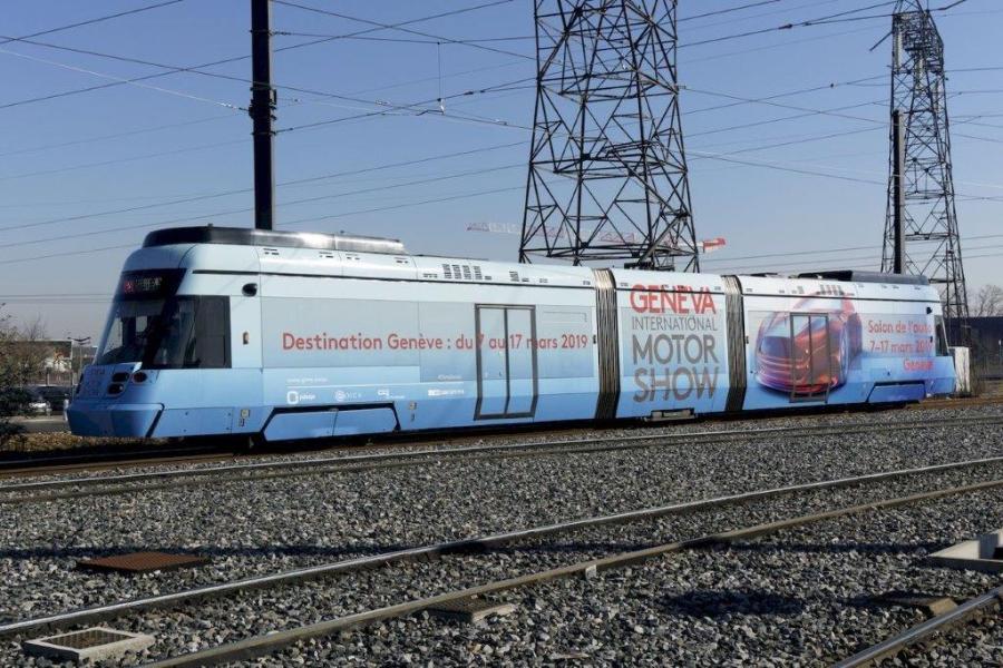 La rame 101 Tango Stadler rhônexpress aux couleurs du salon de l’auto de Genève 2019, circulant en direction de Lyon Gare Part-Dieu – Villette, est photographiée à l’approche de la station « Meyzieu Z.I. », le vendredi 15 février 2019. Copyright : Yvon Brument