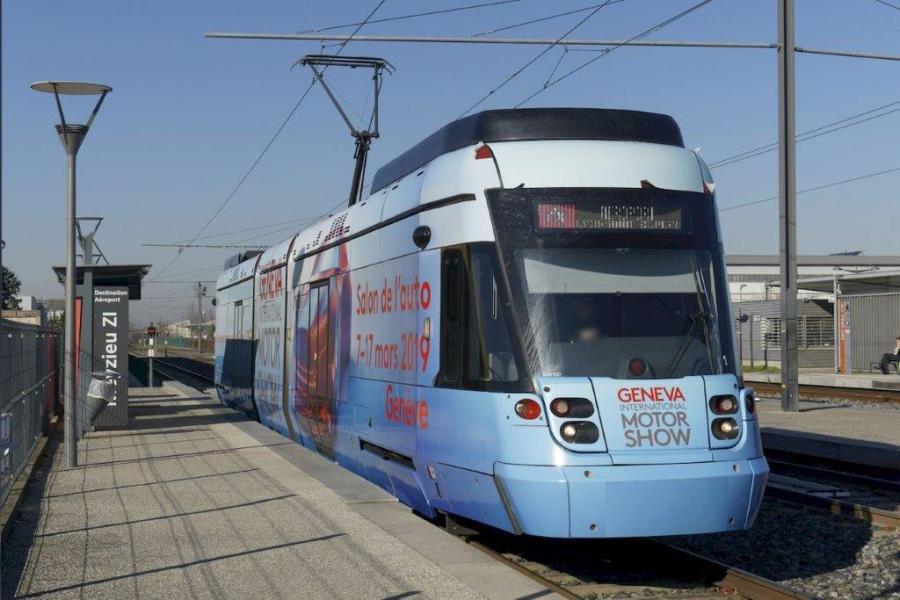 La rame 101 Tango Stadler rhônexpress aux couleurs du salon de l’auto de Genève 2019, circulant en direction de l’aéroport internationale de Lyon – Saint Exupéry, est photographiée à la station « Meyzieu Z.I. », le vendredi 15 février 2019. Copyright : Yvon Brument