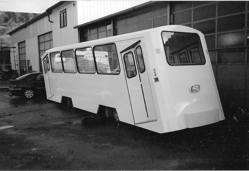 Photographie prise au mois de février 1995 d’une des deux cabines du funiculaire de la grotte de l’Aven Armand ayant fait l’objet d’une cure de jouvence chez le carrossier Artière à Millau. Copyright : Michel Bozzola