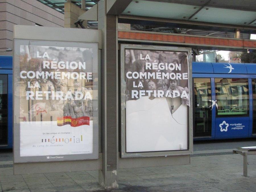 Une affiche à moitié déchirée dans une armoire publicitaire vandalisée de la station « Corum » photographiée le dimanche 24 février 2019, au lendemain du passage des casseurs. Copyright : Edouard Paris