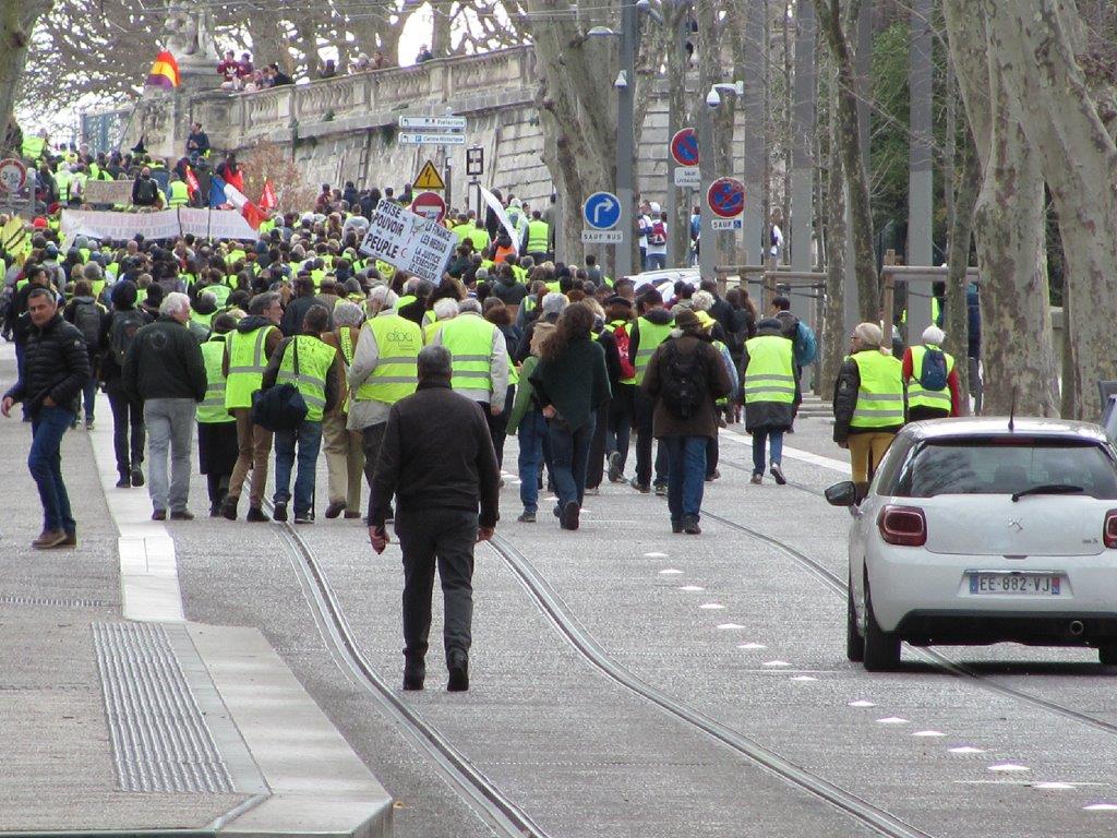 Queue de la procession des gilets jaunes sur la plateforme de la ligne 4 de tramway, boulevard Henri IV à Montpellier, le samedi 2 mars 2019 à 15h01. Copyright : Edouard Paris