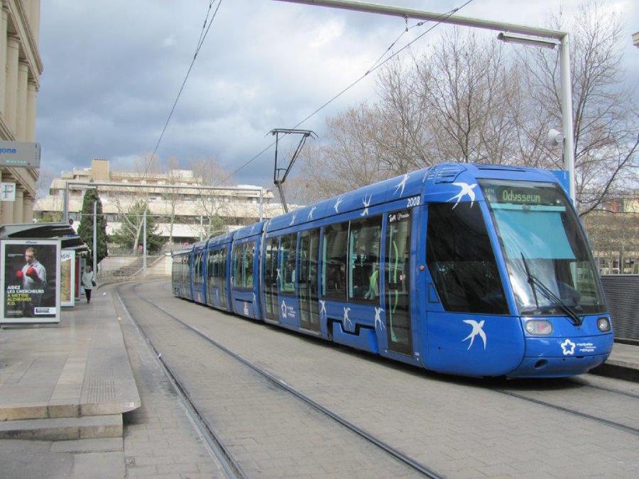 La rame 2008 Citadis 401 Alstom, photographiée à la station « Antigone », le samedi 3 mars à 14h06, est la dernière a être passée par la place de la Comédie avant la modification de l’itinéraire des rames de la ligne 1, manifestation de gilets jaunes oblige. Copyright : Edouard Paris