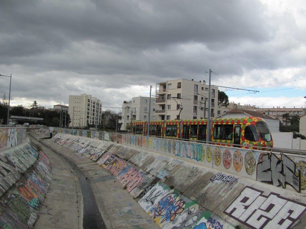 La rame 2063 Citadis 302 Alstom, opérant sur la ligne 2, est photographiée sur la plateforme de la ligne 4, rue de la Pépinière, entre les stations « Les Aubes » et « Pompignane », le samedi 2 mars 2019 à 14h34, jour de manifestation de gilets jaunes en centre-ville de Montpellier. Copyright : Edouard Paris