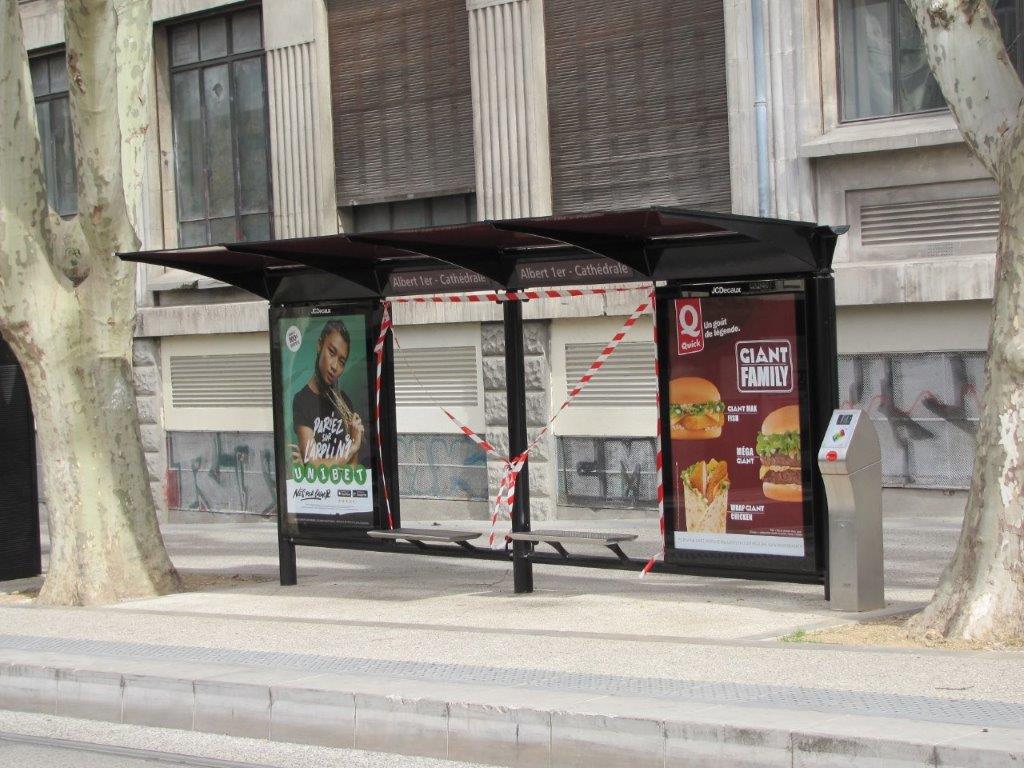 Abri de la station « Albert 1er – Cathédrale » propre à la ligne 4 de tramway, dont les parois vitrées n’ont pas été remplacées après qu’elles ont été vandalisées le samedi 2 mars 2019 en marge d’une manifestation de gilets jaunes. Photo prise le samedi 9 mars 2019 à 14h44. Copyright : Edouard Paris