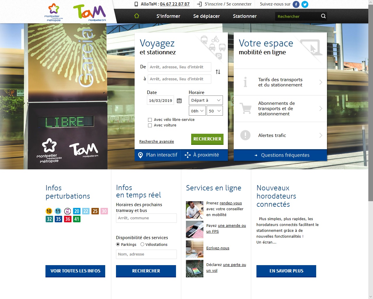 Capture d’écran de la page d’accueil du site TaM Montpellier 3M, le samedi 16 mars 2019 à 9h02