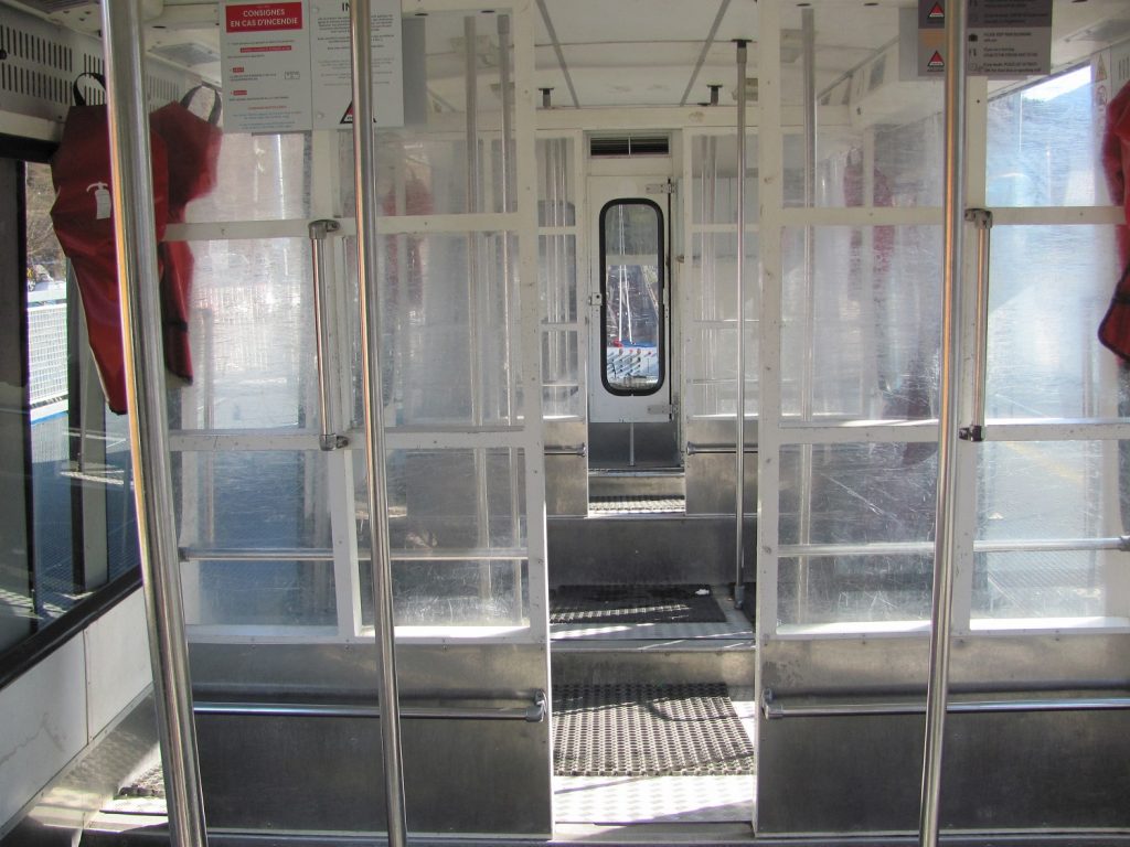 Aménagement intérieur de la caisse côté amont de la rame n°2 du funiculaire Bourg-Saint-Maurice – Arc 1600. Les compartiments ne disposent pas de places assises. Photo prise le 19 mars 2019. Copyright : Edouard Paris