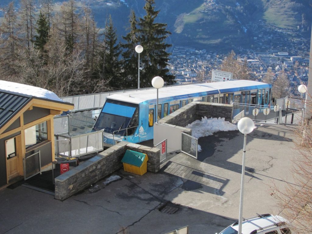 La rame double caisse n°2 du funiculaire Bourg-Saint-Maurice – Arc 1600 est photographiée à la station « Arc 1600 », le mardi 19 mars 2019. Copyright : Edouard Paris