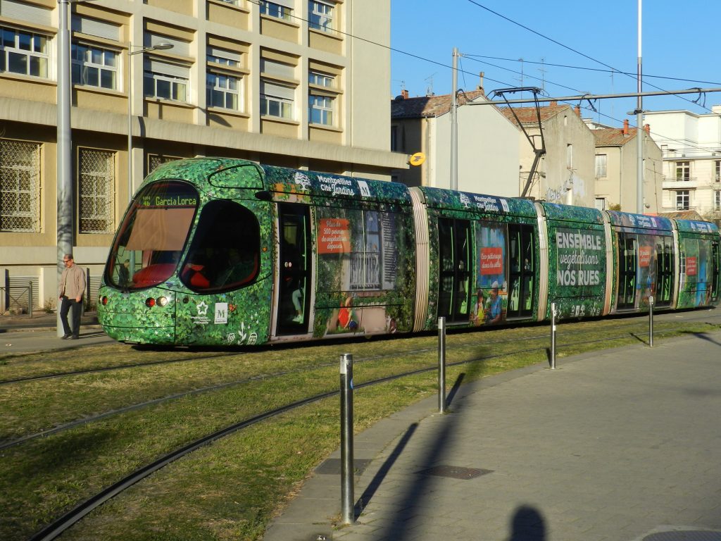 La rame 2049 Citadis 302 Alstom habillée de sa nouvelle livrée sur le thème « Montpellier Cité Jardins » photographiée peu de temps après avoir quitté la station « Rondelet » commune aux lignes 2 et 4, le mercredi 20 mars 2019. Copyright : Anje34