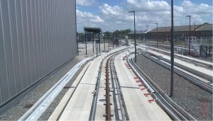 - Capture d’écran d’une image provenant d’une vidéo de présentation des premiers essais d’une rame CityVal Siemens dans l’enceinte du centre de maintenance « La Maltière » sur la commune de Saint-Jacques-de-la-Lande, au mois de juillet 2018. Aperçu des bandes de roulement bétonnées de part et d’autre du système de guidage des rames. Document Rennes Métropole