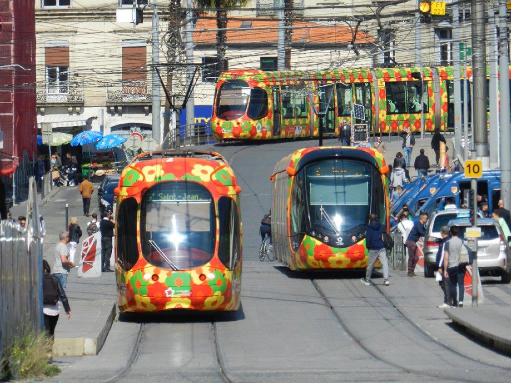 Rue Jules-Ferry à Montpellier, les rames fleuries de la ligne 2 ne passaient plus par la place de la Comédie, ce samedi 13 avril 2019 à 15h51, acte XXII des gilets jaunes. Copyright : Anje34