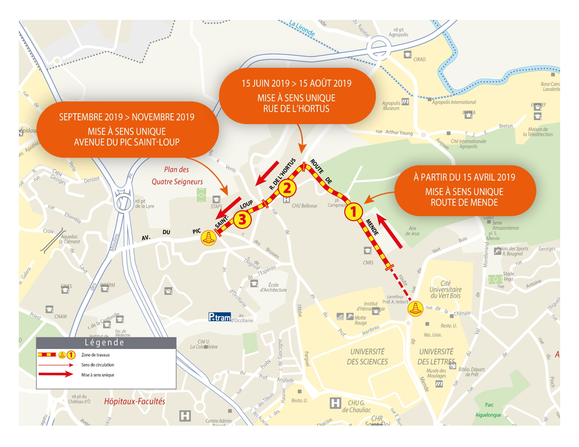 Information sur la route de Mende à Montpellier destinée aux automobilistes qui seront contraints de changer leurs habitudes à compter du lundi 15 avril 2019. Document : Montpellier Méditerranée Métropole