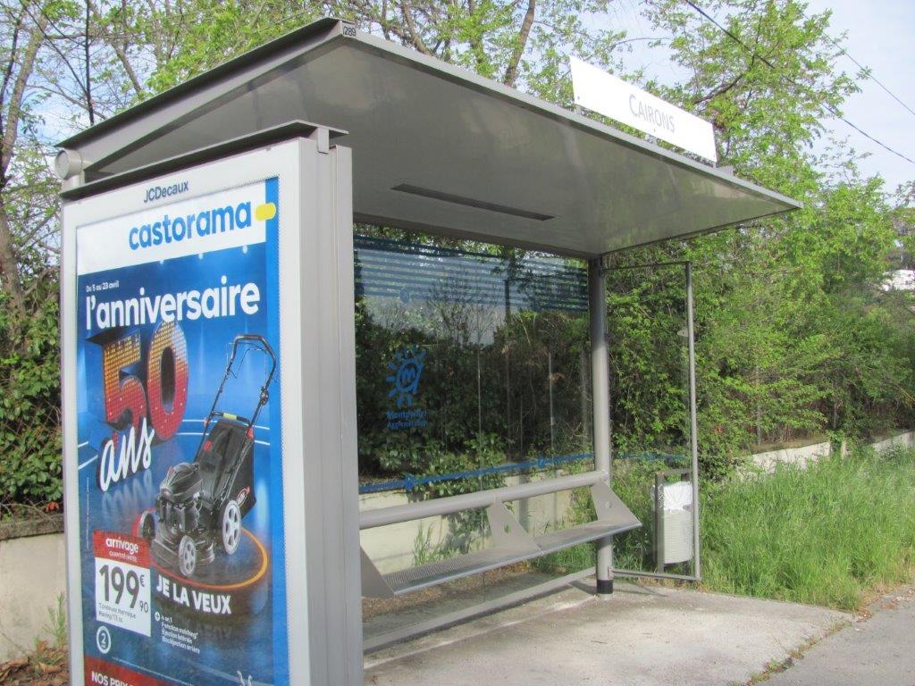 Route de Mende à Montpellier, abri de l’arrêt « Cairons » de la ligne 22 de bus urbain qui ne sera plus desservi dans le sens nord – sud du lundi 15 avril 2019 au vendredi 16 octobre 2020. Photo prise le dimanche 14 avril 2019. Copyright : Edouard Paris