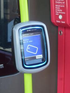 - Photographie d’un des valideurs embarqués d’une rame Citadis 402 Alstom opérant sur la ligne A du tramway de Tours, le lundi 25 mars 2019. Copyright : Michel Bozzola