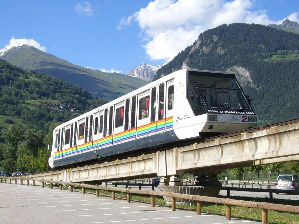 La rame double caisse n°2 du funiculaire Bourg Saint-Maurice – Arc 1600 est photographiée sous sa livrée d’origine « Arc en Ciel », le jeudi 12 juillet 2007. Copyright : Michel Bozzola