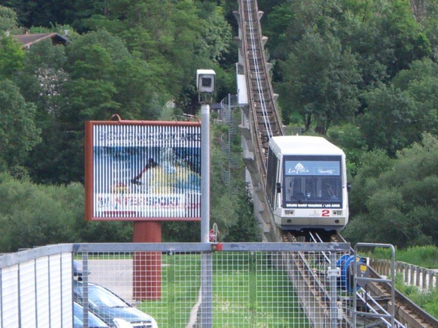 La rame double caisse n°2 du funiculaire Bourg Saint-Maurice – Arc 1600 est photographiée sous sa livrée d’origine « Arc en Ciel », le mardi 22 juillet 2008, quelques secondes après avoir quitté la station aval « Bourg Saint Maurice ». Copyright : Michel Bozzola