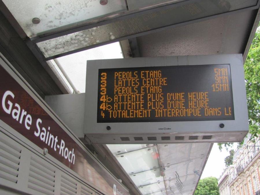 Photographie du panneau électronique d’information de la station « Gare Saint-Roch », quai directions « Lattes Centre » et « Pérols – Etang de l’Or » pour la ligne 3 et « Garcia Lorca » sens b pour la ligne 4, le samedi 4 mai 2019 à 13h48. Copyright : Edouard Paris