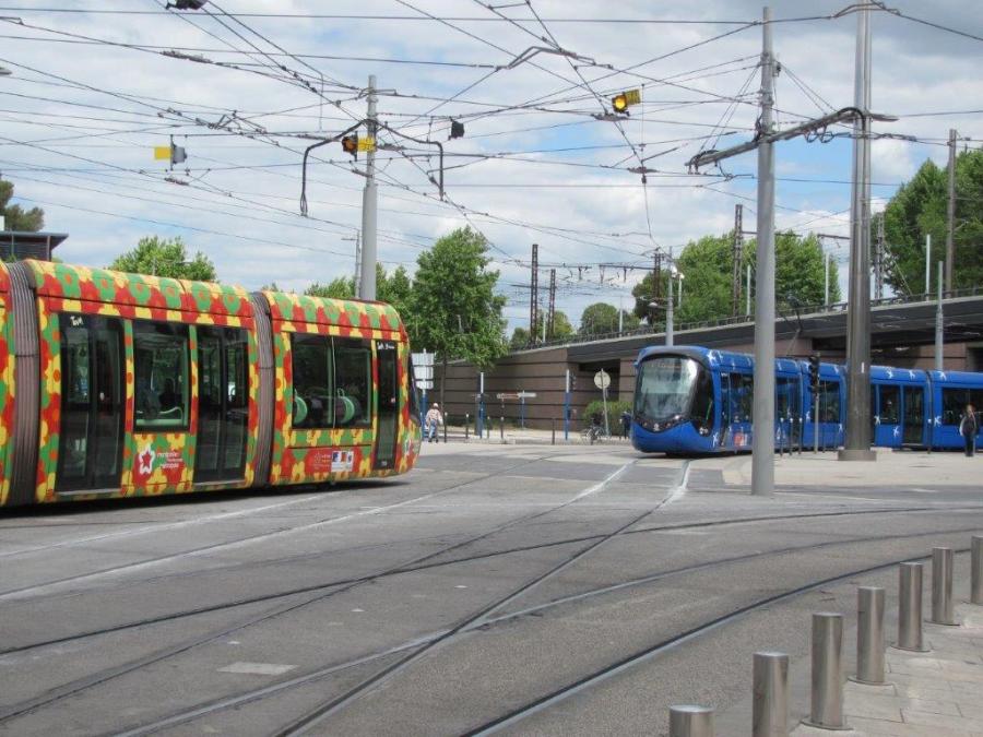 Place du 11 Novembre 1918 à Montpellier, la rame 2092 Citadis 402 Alstom, opérant sur la ligne 1, suivie de la rame 2060 Citadis 302 Alstom, opérant sur la ligne 2, prennent la direction de la station « Place de l’Europe » via la station « Les Aubes », le samedi 4 mai 2019 à 14h11, en raison de la présence de gilets jaunes sur la place de la Comédie. Copyright : Edouard Paris