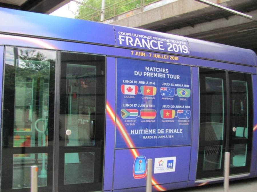 Liste des matches de la Coupe du Monde Féminine de la FIFA, France 2019, organisés au stade de la Mosson de Montpellier, consultable sur une face d’un module de la rame 2098 Citadis 402 Alstom multiligne. Photo prise le samedi 4 mai 2019. Copyright : Edouard Paris