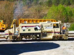 - Une bourreuse « Unimat-Junior » appartenant à l’entreprise italienne De Aloe Costruzioni, dont le siège est à Brescia, est photographiée en gare de Villars-sur-Var, sur la ligne Nice – Digne des Chemins de fer de Provence, le lundi 8 avril 2019. Copyright : Michel Bozzola