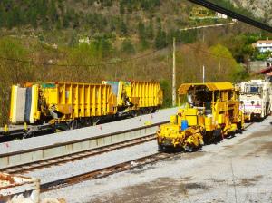 - Des engins de travaux de voie appartenant à l’entreprise italienne De Aloe Costruzioni, dont le siège est à Brescia, sont photographiés en gare de Villars-sur-Var, sur la ligne Nice – Digne des Chemins de fer de Provence, le lundi 8 avril 2019. Copyright : Michel Bozzola