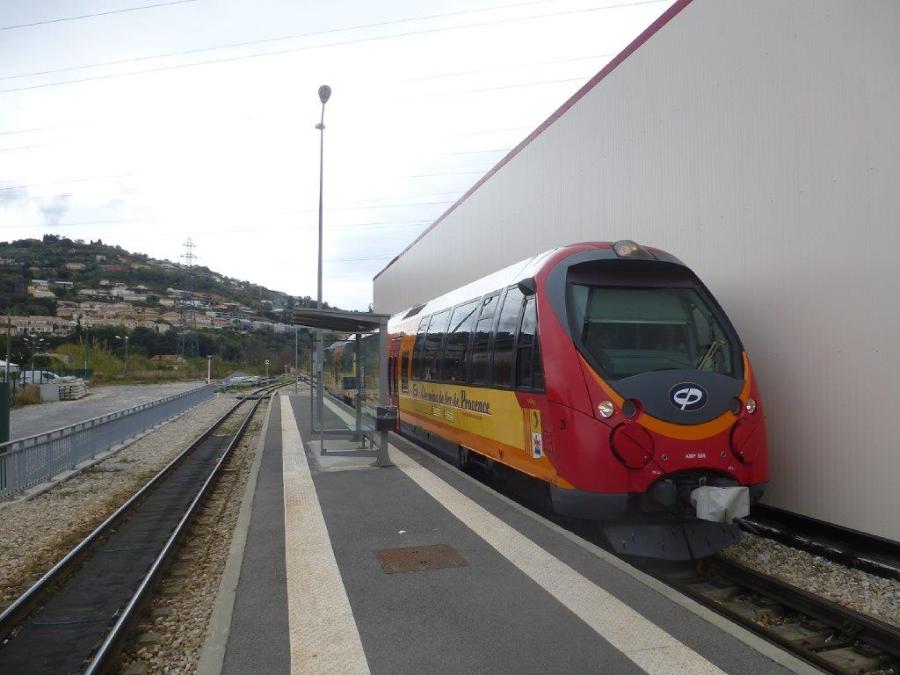 L’autorail articulé double motrice AMP 807/808 est photographié en gare de Lingostière devant la nouvelle halle de levage des ateliers des Chemins de fer de Provence, le samedi 6 avril 2019. Copyright : Michel Bozzola