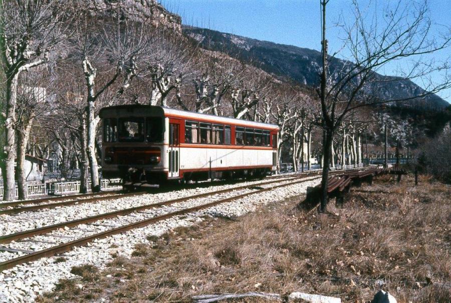 Livré aux Chemins de fer de Provence en décembre 1972 sous le n° SY 04, l’autorail X 304 CFD Montmirail totalisait 4 181 549 km au 1er janvier 2019. Un record pour un autorail qui devait être amorti au bout de 20 ans d’exploitation. Le voici sous sa livrée et son numéro d’origine à Puget-Théniers, le dimanche 15 mars 1981. Copyright : Michel Bozzola
