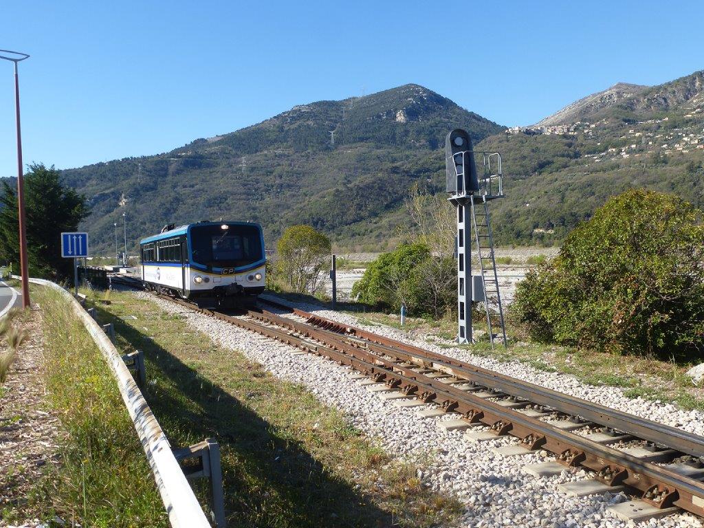L’autorail X 306 CFD Montmirail des Chemins de fer de Provence est photographié quelques secondes après son départ de la gare de Saint-Martin-du-Var, en direction de La Vésubie-Plan du Var, le lundi 8 avril 2019. Copyright : Michel Bozzola