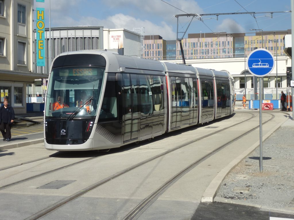 A Caen, la rame 004 Citadis 305 Alstom en essais est photographiée sur le futur tronc commun des lignes T1 et T3, en direction du sud, peu de temps après avoir quitté la station « Gare SNCF », le mardi 26 mars 2019. Copyright : Michel Bozzola