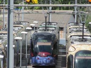 - Vue sur les voies du garage extérieur du dépôt « La jeune Parque » à Montpellier, où les rames opérant sur la ligne 4 sont garées pour cause d’interruption totale de ladite ligne pour cause de manifestion des gilets jaunes en centre-ville. Photo prise le samedi 18 mai 2019 à 16h11. Copyright : Edouard Paris
