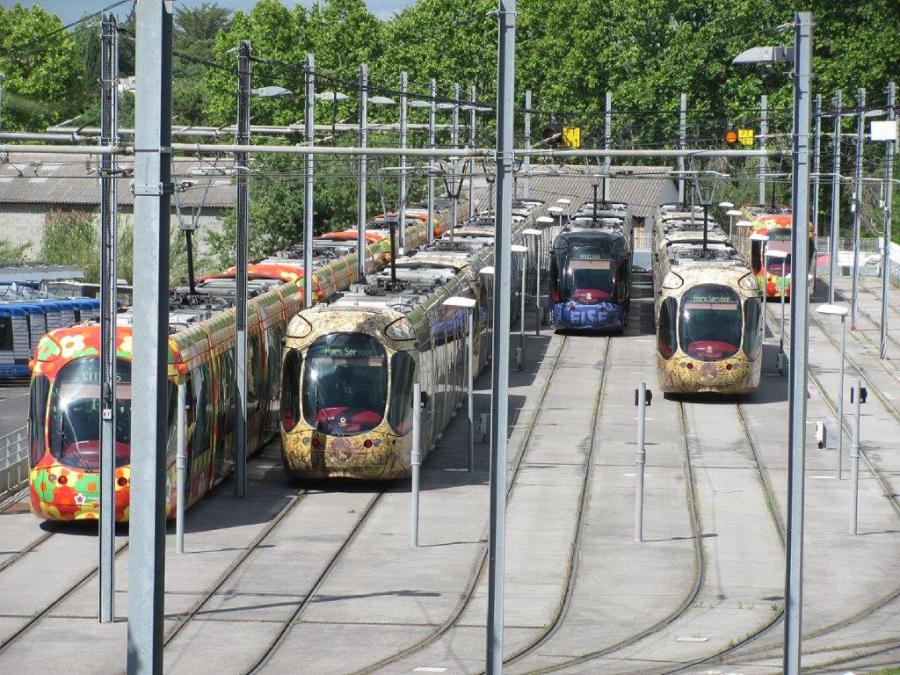 Vue sur les voies du garage extérieur du dépôt « La jeune Parque » à Montpellier, où les rames opérant sur la ligne 4 sont garées pour cause d’interruption totale de ladite ligne pour cause de manifestion des gilets jaunes en centre-ville. Photo prise le samedi 18 mai 2019 à 16h11. Copyright : Edouard Paris