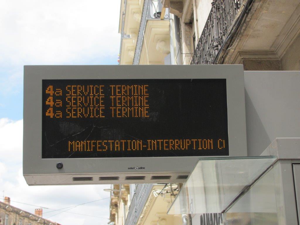 Photographie du tableau d’information de la station « Saint-Guilhem – Courreau » quai 4a, le samedi 18 mai 2019 à 14h12, acte XXVII des gilets jaunes. Copyright : Edouard Paris
