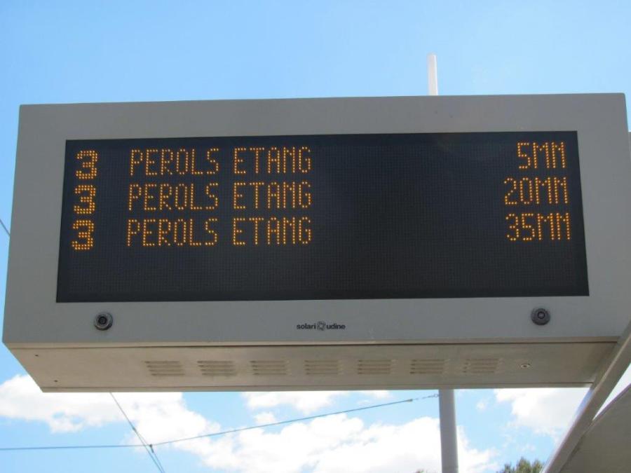 Tableau électronique d’information de la station « Jules Guesde » sur la ligne 3, quai directions « Pérols – Etang de l’Or » et « Lattes Centre », photographié le dimanche 12 mai 2019 à 13h40, durant la plage horaire où toutes les rames circulent en direction du terminus « Pérols – Etang de l’Or ». Copyright : Edouard Paris