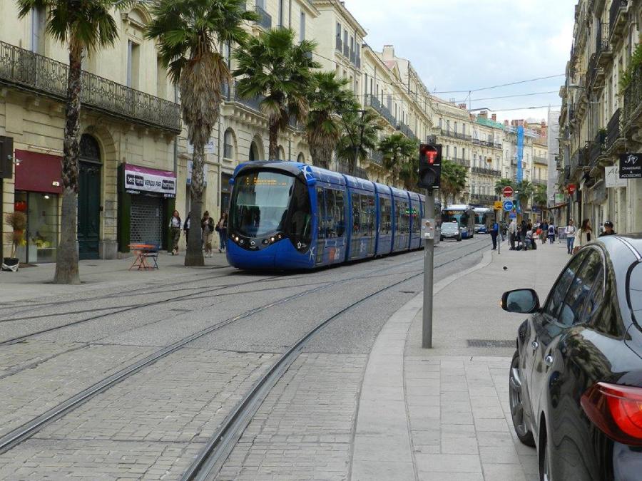 Le vendredi 24 mai 2019, à 11h46, la rame 2091 Citadis 402 Alstom est photographiée sur le boulevard du Jeu-de-Paume, en dehors de son itinéraire habituel, sur la voie normalement empruntée par les rames de la ligne 4 dans le sens 4b, en raison d’une manifestation liée à la grève du climat organisée par les lycéens et étudiants montpelliérains dans l’Ecusson. Copyright : Anje34