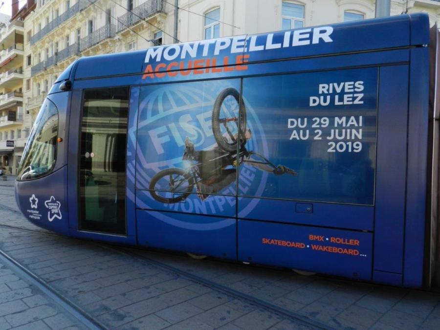 Gros plan sur le pelliculage intégral FISE 2019 appliqué sur chaque face latérale des deux motrices de la rame 2048 Citadis Alstom multiligne. Photo prise place Auguste-Gibert à Montpellier, le lundi 27 mai 2019. Copyright : Anje34